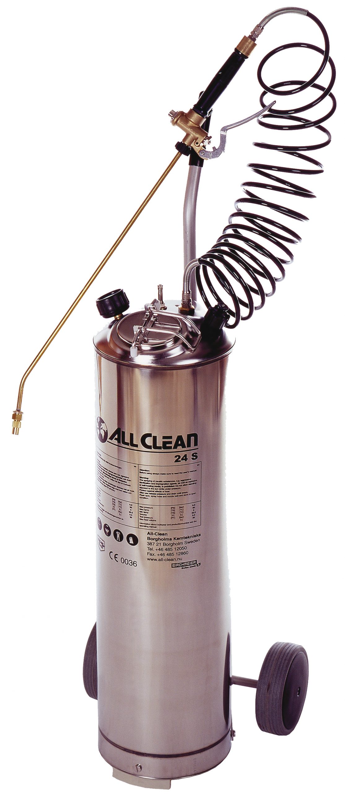 Rostfri koncentratspruta på hjul. Allclean.
