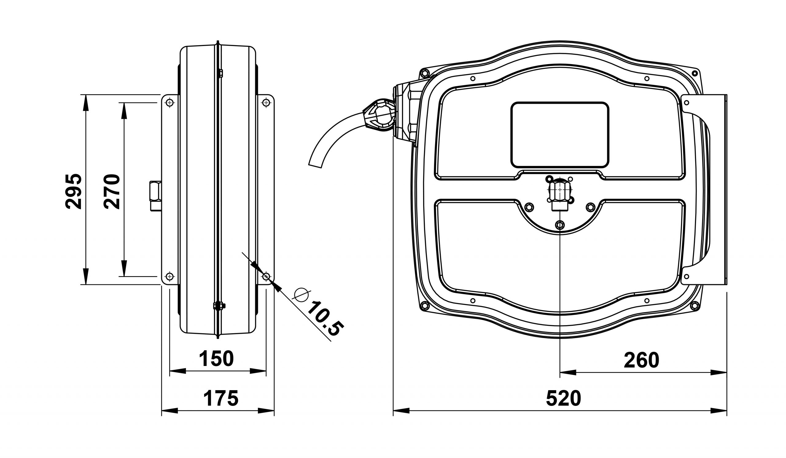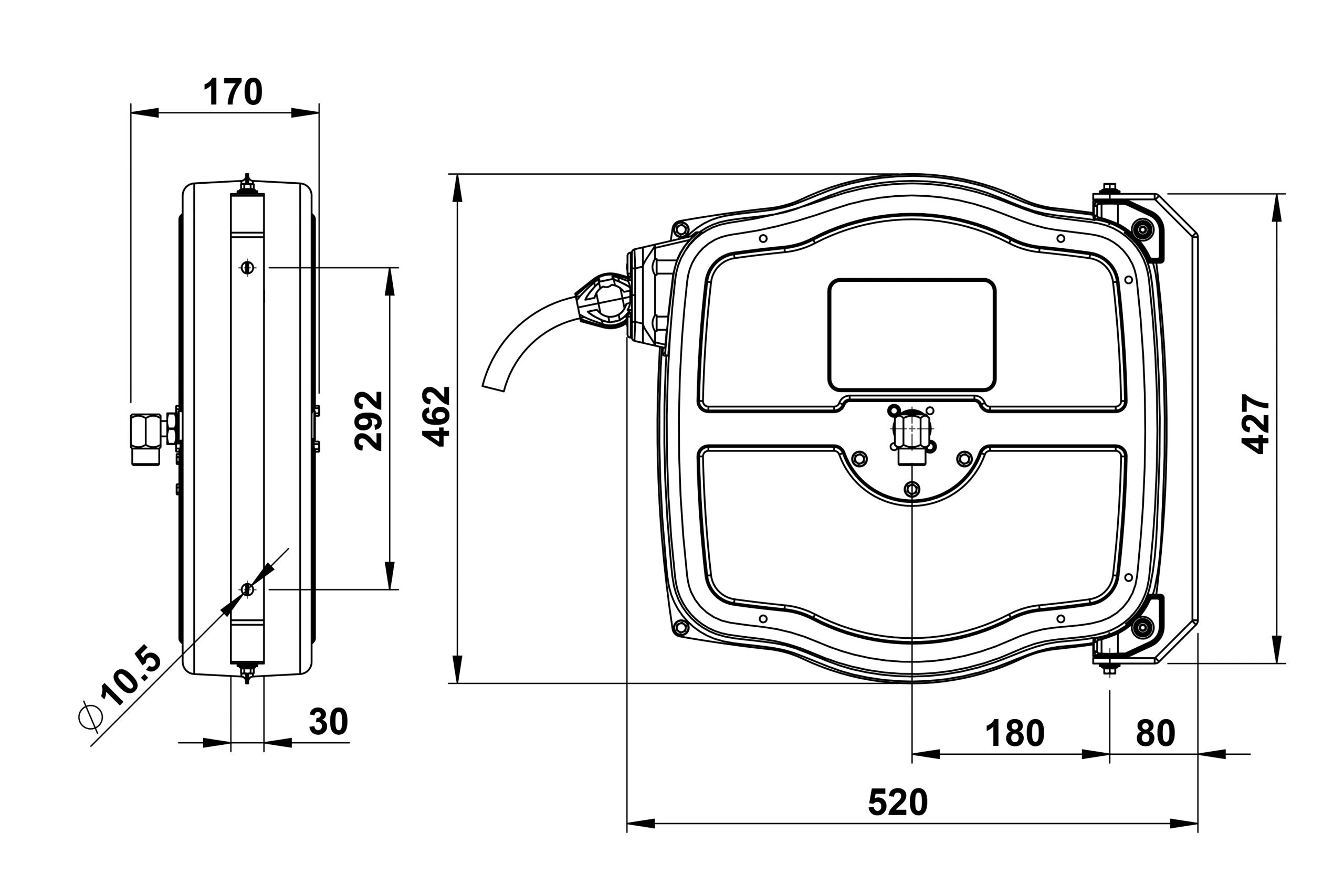 Slangvindorna är kapslade och tillverkade av stål. Slangen är av polyuretan och mjuk även vid låga temperaturer. De är utrustade med returfjäder. Vindorna levereras med svängbart väggfäste.